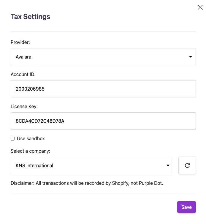Click the Settings button within your Taxes settings and it will bring up a window where you can select Avalara and enter your Account ID and Licence Key. Select your company name and then test your connection.