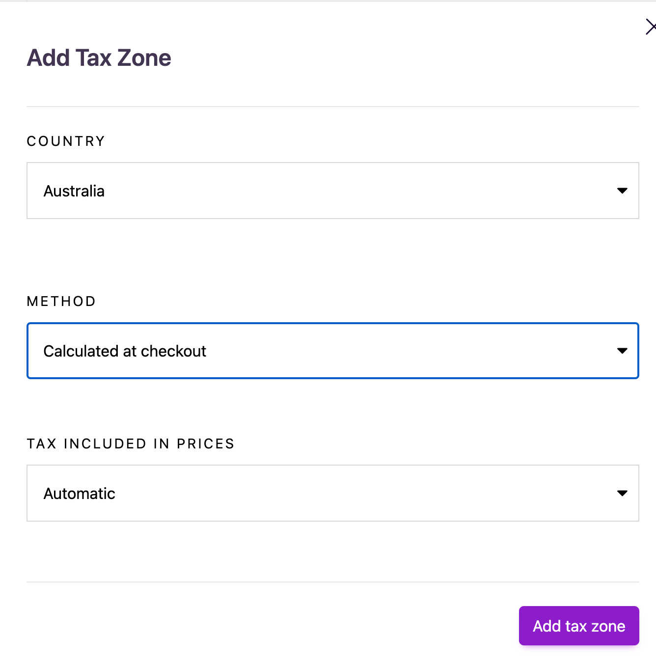 Click the Add tax zone button and it will bring up a window where you can select the Country and/or State, the method (Calculated at checkout, flat rate, calculated by Avalara, calculated by EAS), as well as if you will include the tax in the prices.