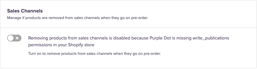 - Turning off this feature will stop Purple Dot from updating channels when products go on pre-order. If you turn it off, the current channel settings for live pre-order products will remain unchanged.
