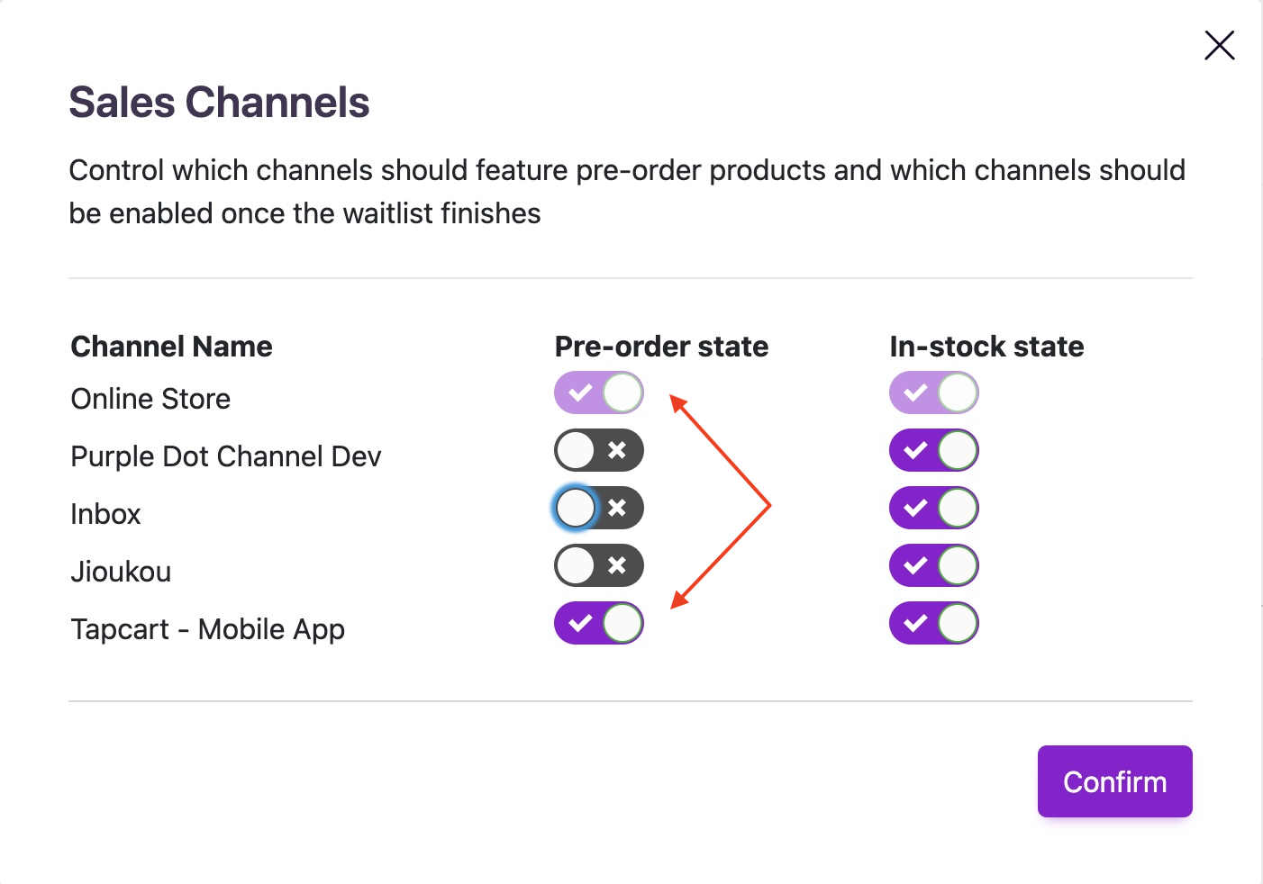 Now, Purple Dot automatically manages the sales channels for your waitlisted products when they come on and off pre-order.