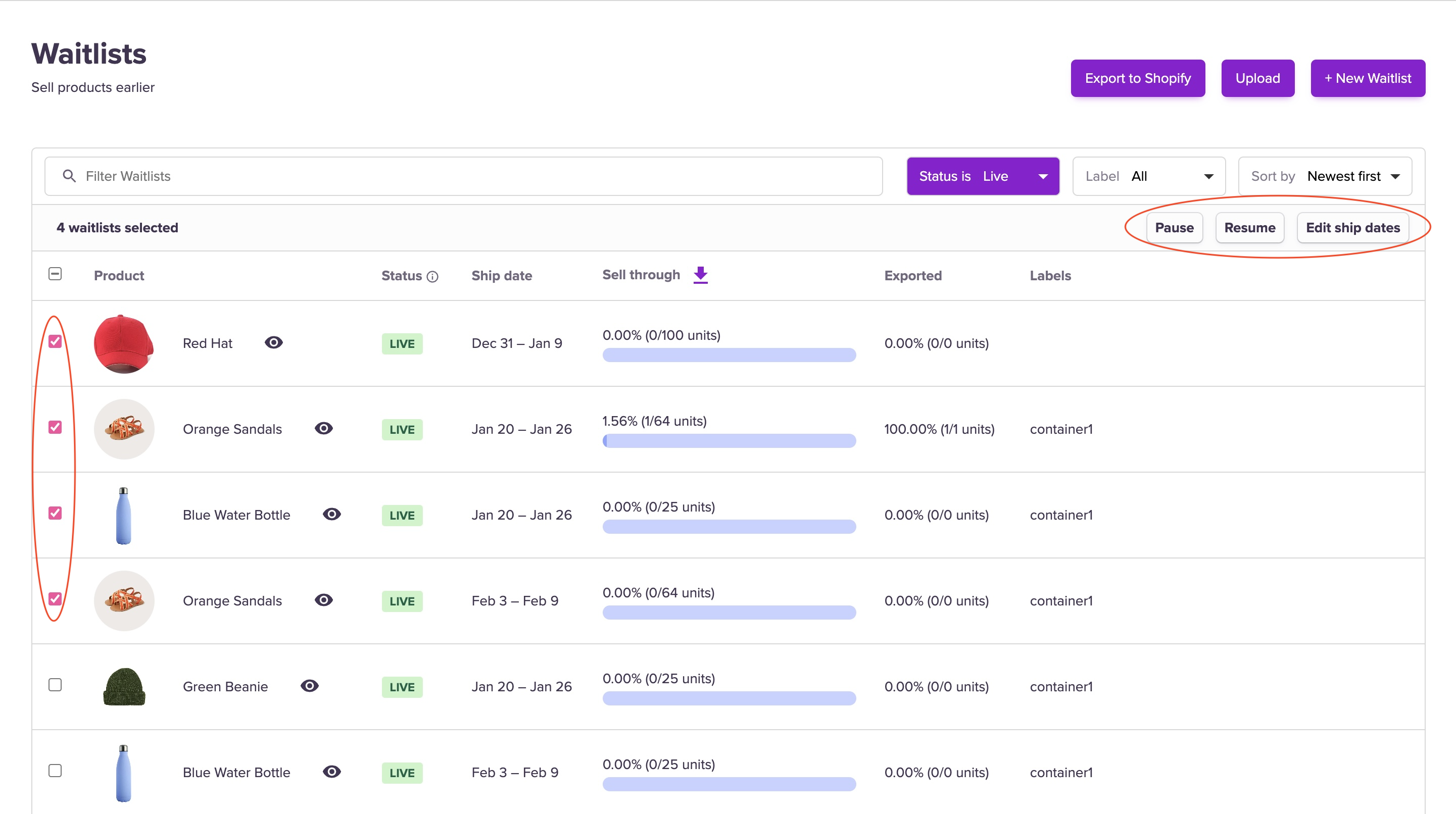From the Waitlists tab in your dashboard, you can now select multiple waitlists at once to Pause, Resume or Edit Ship Dates.