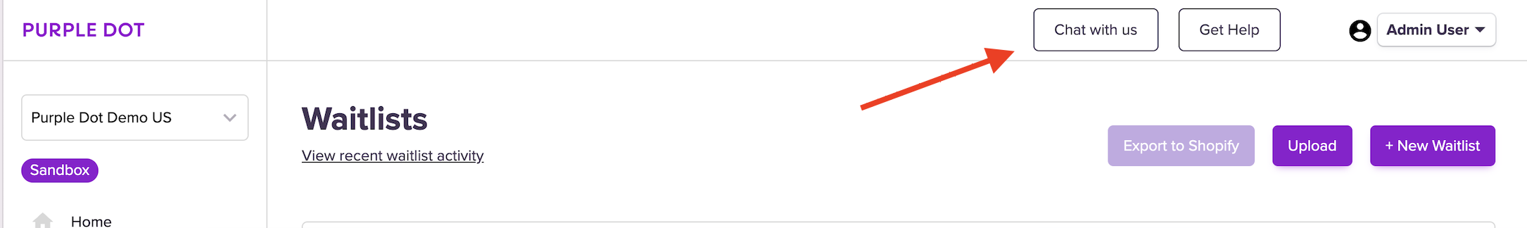 - The Purple Dot dashboard, in our dashboard you can click "Chat with us" to directly contact support.