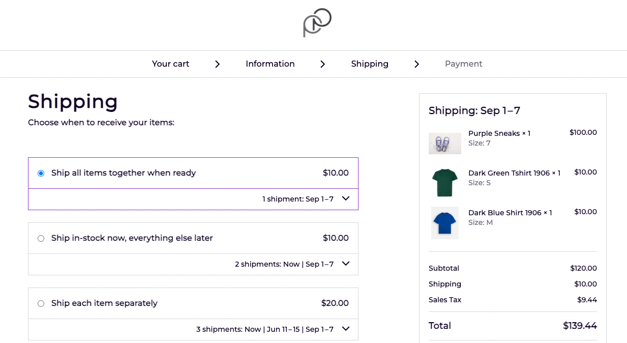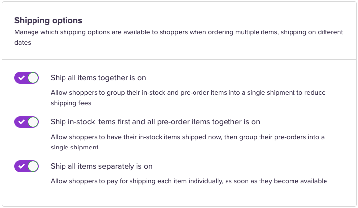 - Ship all items separately: In-stock items are automatically synced with your existing rates in Shopify (with an option to override). You can then apply the same or different rates for the pre-order portions of the order. Each item will be shipped separately as stock becomes available.