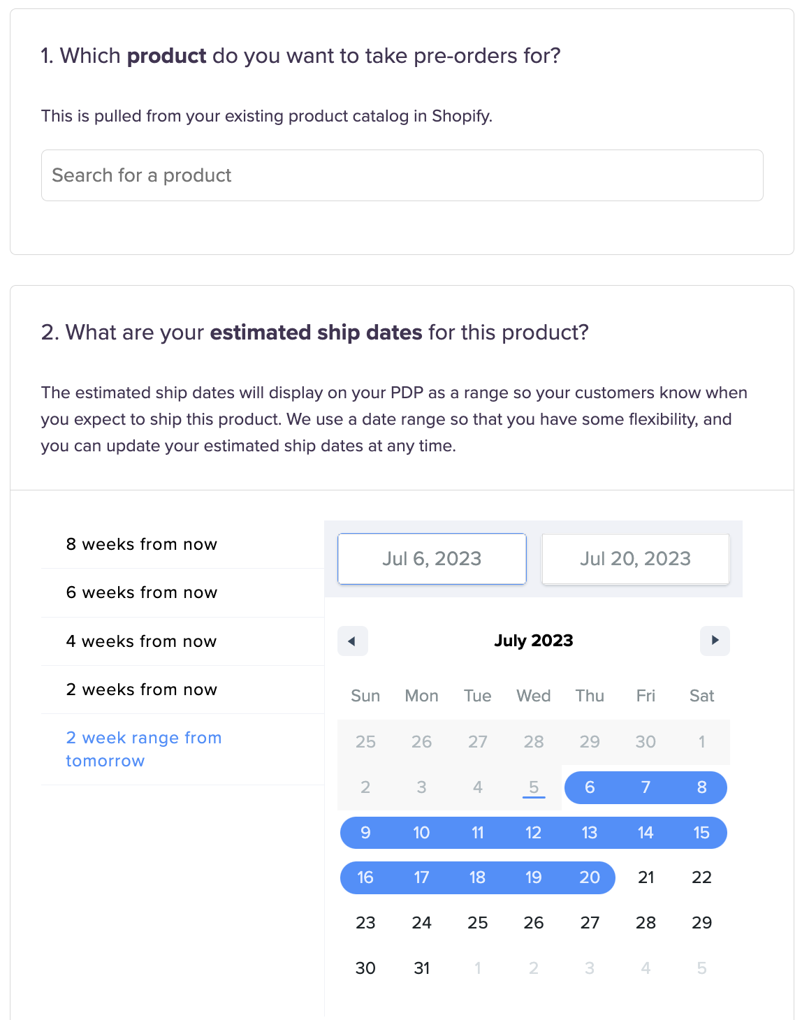 First, select a product you want to run a waitlist for. Next, choose a date window for when the pre-orders will ship to the customer and how much stock you want to make available for pre-order.