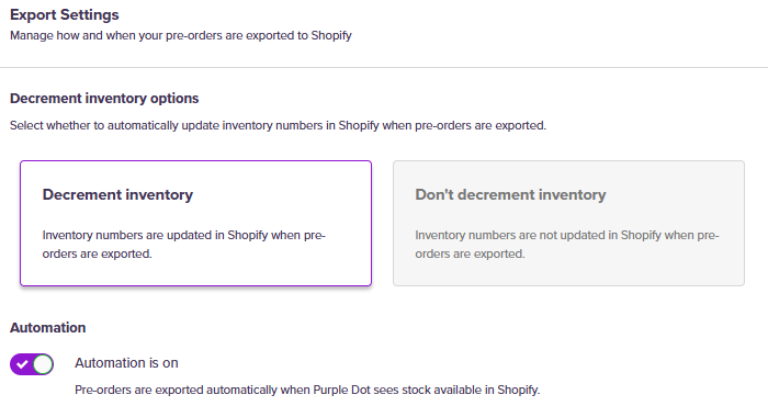 When Purple Dot sees inventory arrive in Shopify, it will automatically export the pre-orders to Shopify, and the inventory numbers in Shopify will be adjusted down accordingly.