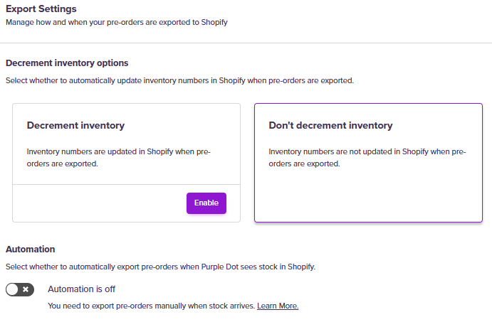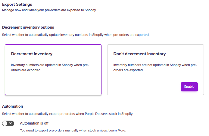 You have three options to choose from for how Purple Dot affects your Shopify inventory: