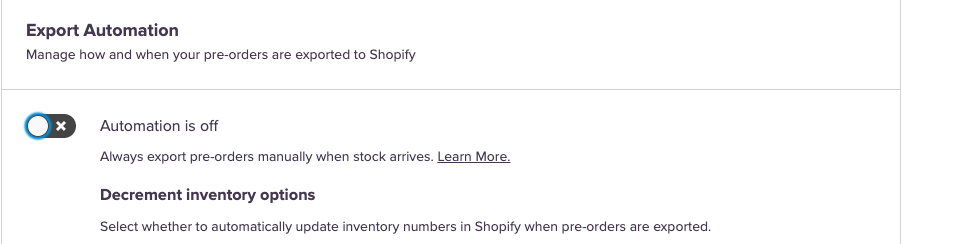For this setting, you'll always export pre-orders manually when stock arrives. Once the orders are exported, your Shopify inventory numbers are not updated.