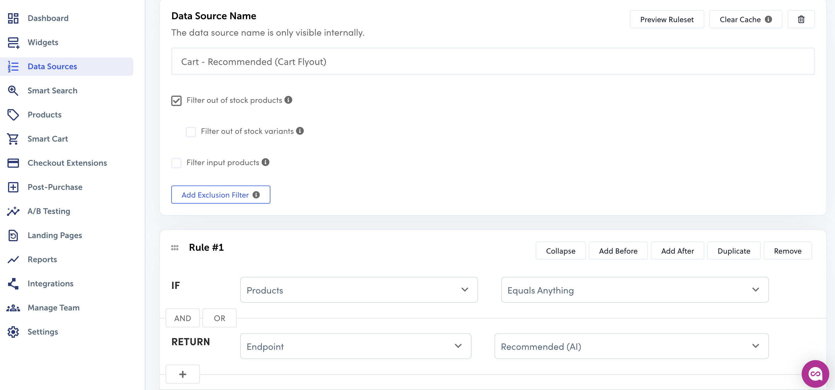 - From the same widget page, click “Data Source” > tick “filter out of stock products” > create Rule “If Products Equals Anything AND/OR Return Endpoint Recommended (AI)” > Save