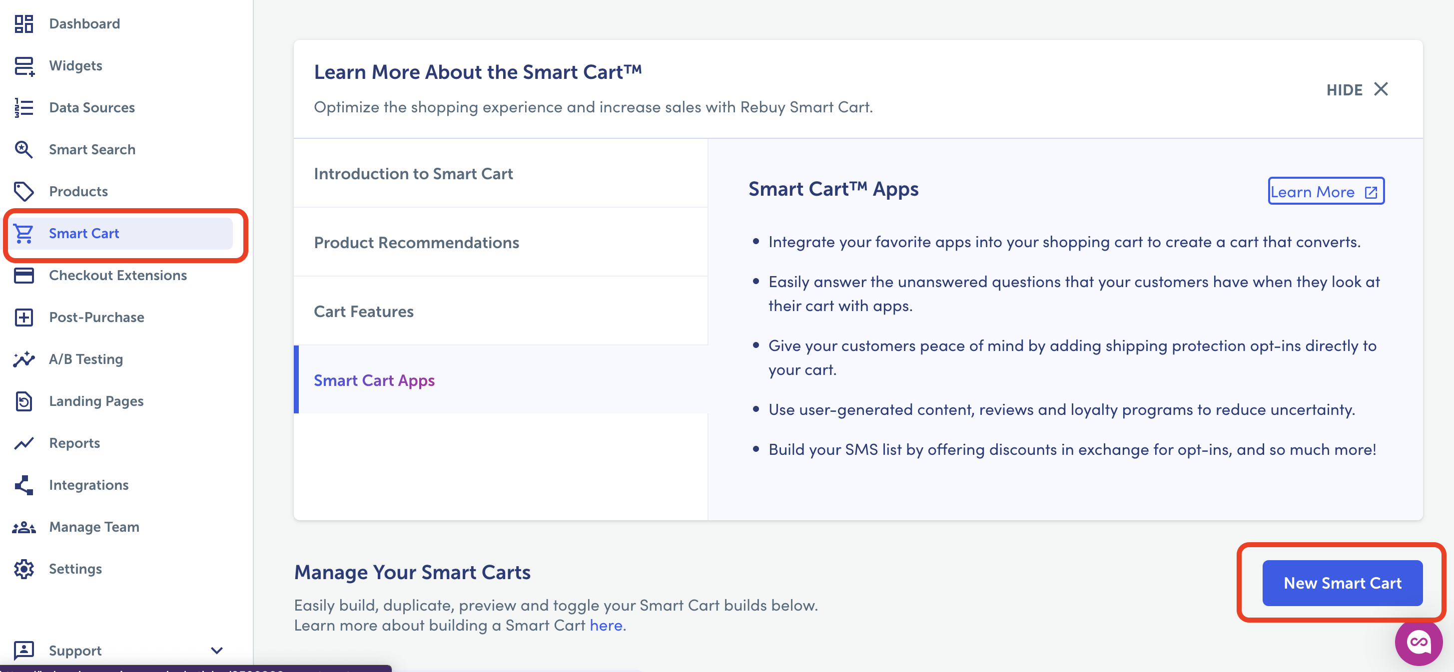 - Go to the “Smart cart” tab > click “new cart app” --> this will enable the side cart functionality.