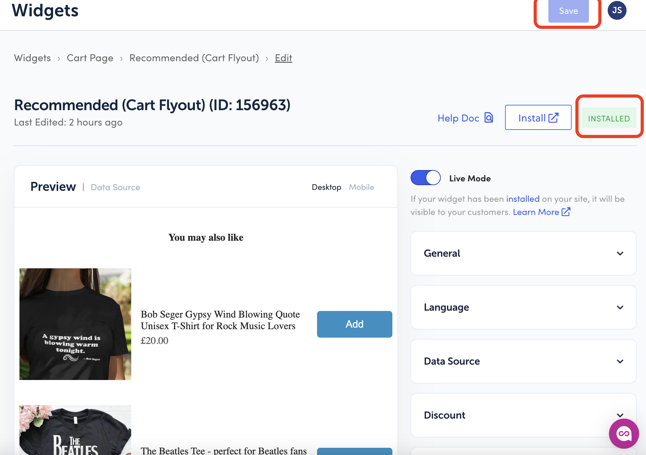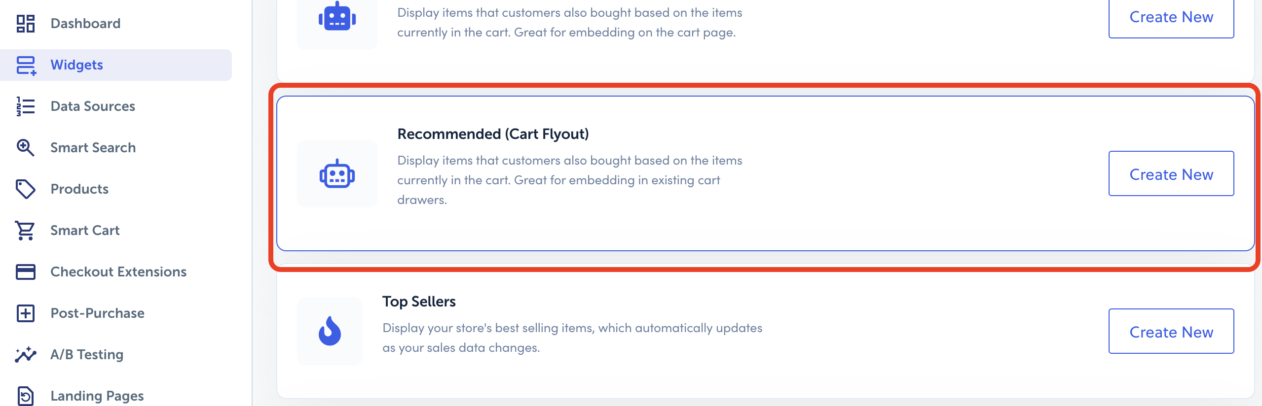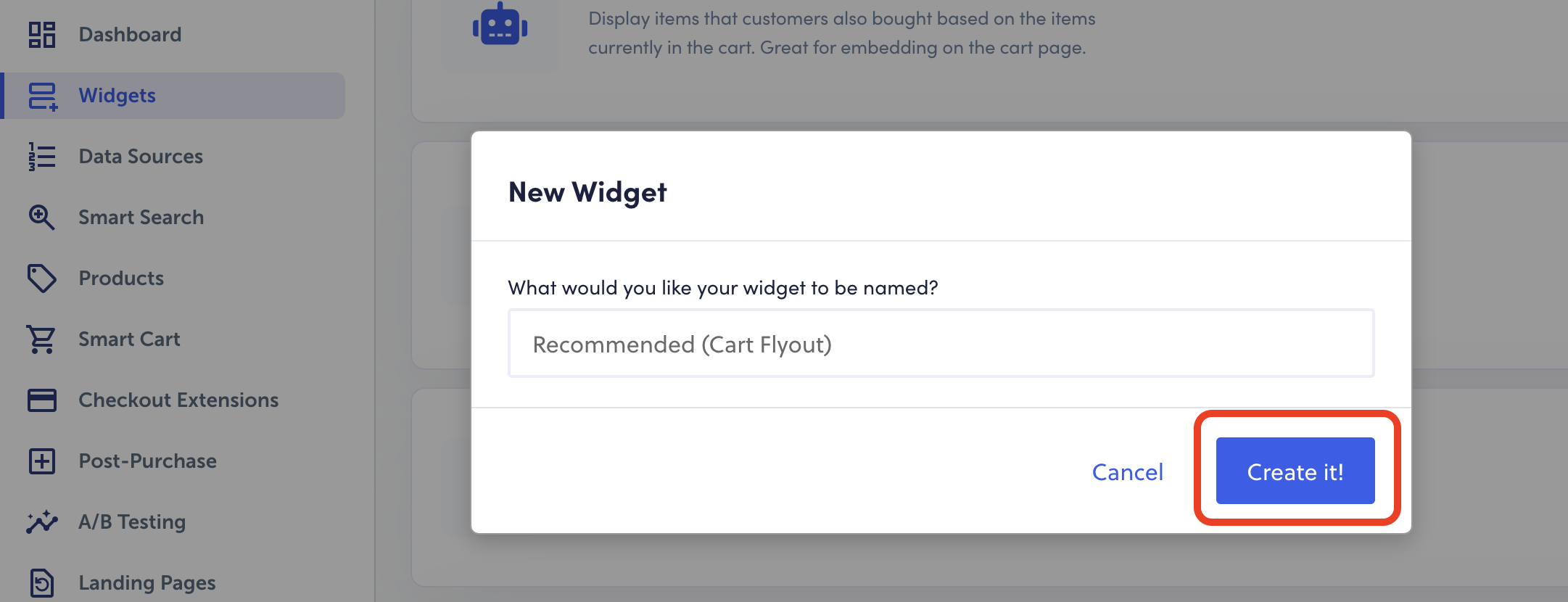 - Go to the “Widget” tab > click “cart” > “new widget” > “recommended (cart flyout) > Name it > Create it > Save Changes