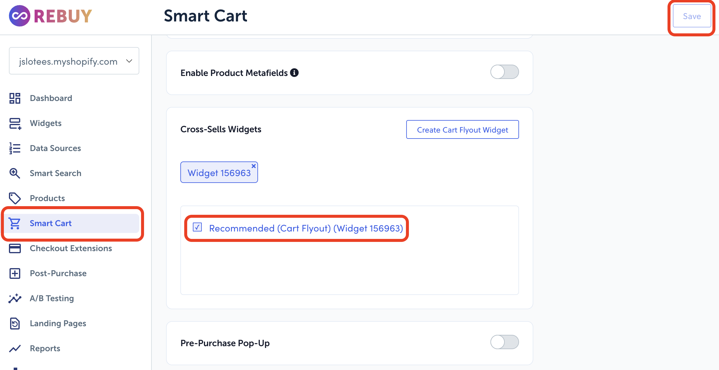 - Go back to the Smart Cart you created > scroll to “Cross-sells Widget” > tick the box of the widget you created > Save