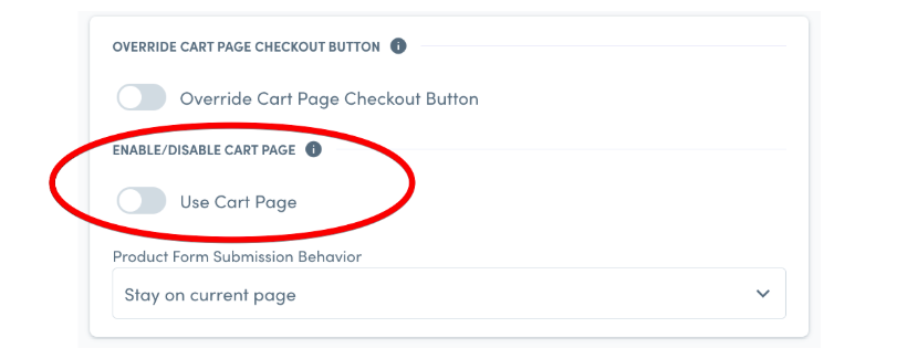 Note: We do not support the Disabled Cart Page in Rebuy. Please turn this toggle off if you use it in your Rebuy settings. A screenshot of the setting is below:
