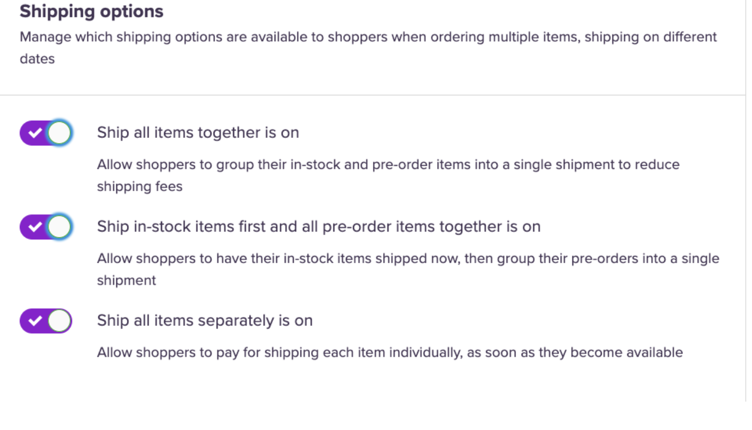 - Ship in-stock items first, and all pre-order items together: In-stock items will ship right away, with pre-order line items held back until all are available.