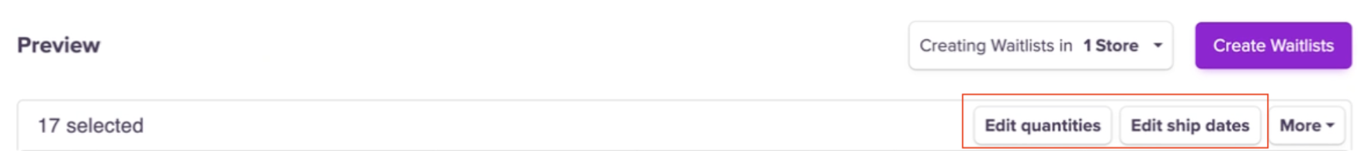 Once your PO has been uploaded, a list of draft waitlists will be available for your review. Here, you will see a list of products and SKUs. You can remove selected SKUs and preview waitlists. You will also be able to amend your shipping dates and quantities by line item or by using the bulk edit feature.