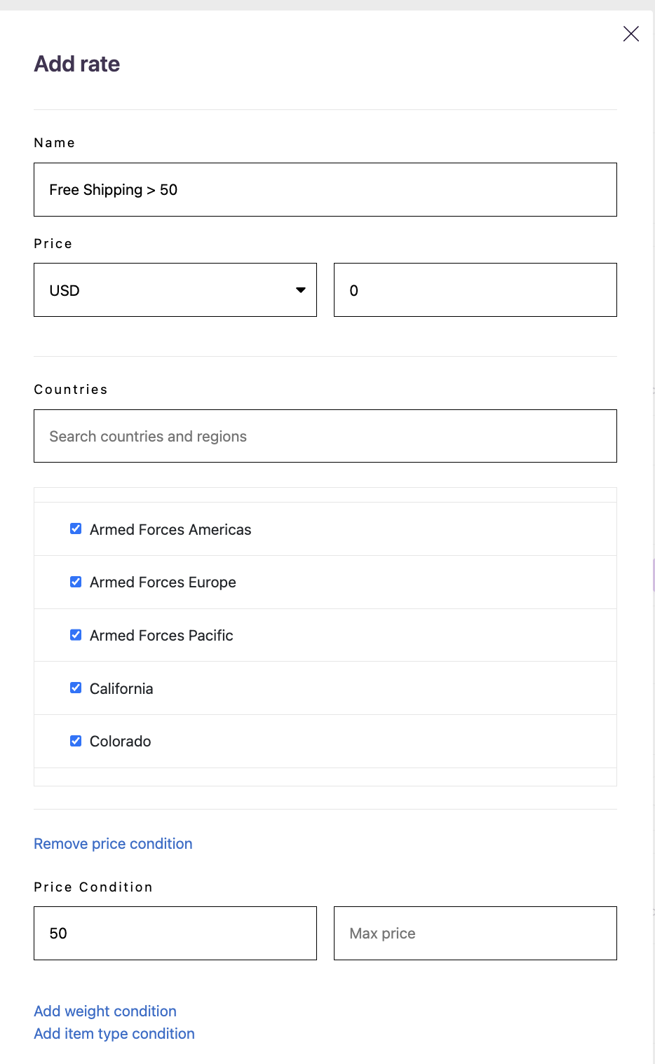 Click the Add rate button and it will bring up a window where you can name the rate, add the price, select the required countries and you can also add a price condition (for eg. Free shipping over $50)
