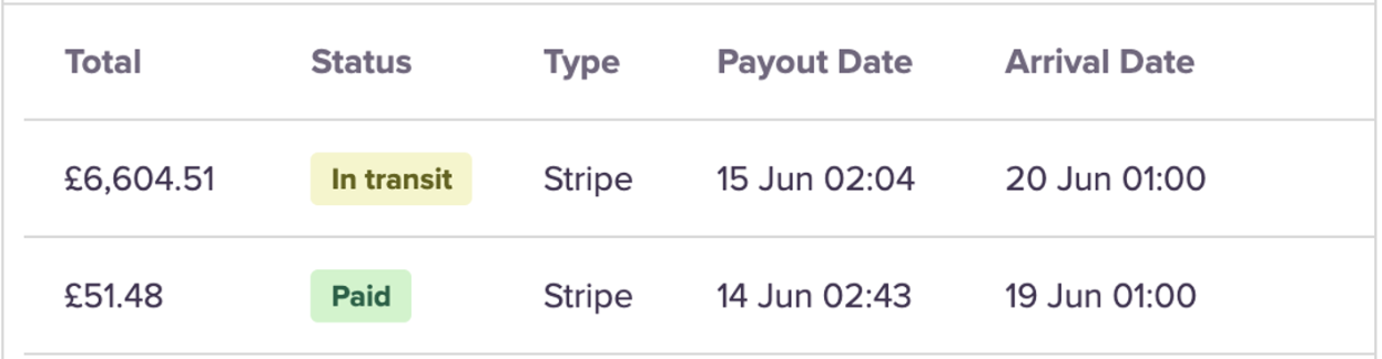 These represent different stages of the payout process. Upcoming payouts reflect money released into your Stripe account and made available for a payout. These funds will automatically be paid into your connected bank account within 2 - 10 business days, initially appearing as “in-transit” and then “paid”. Once a payout becomes visible in the Payouts table (either as in transit or paid), it will no longer be included within the Upcoming payouts figure.