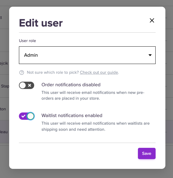 By default, Admin users will also be opted-in to receiving email notification about Waitlists. You can disable these - or enable for other users - by editing the user settings.