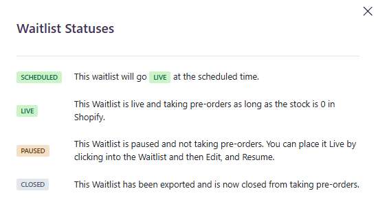 What do the different waitlist statuses mean?Updated 2 days agoDepending on where you're at in the pre-order process, you may see a different waitlist status. Here's what each status means: Was this article helpful? YesNo