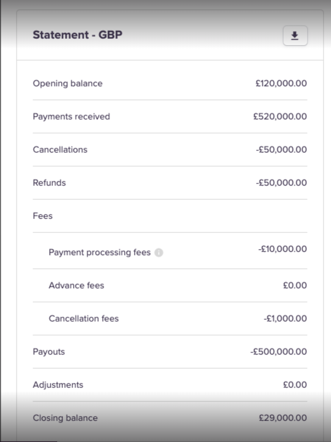 - Closing balance - total of remaining funds held by Purple Dot (including Upcoming payouts) at the end of the defined time period.