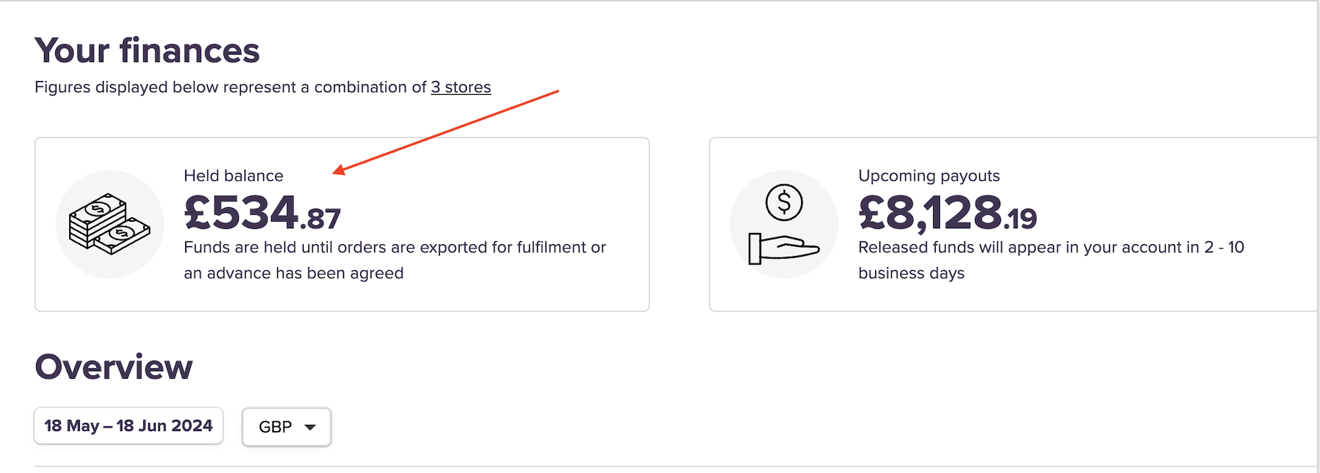 The Held balance represents the money we have taken from shoppers for their orders but has not yet been released to you for payment. Funds will remain held until an order/item is exported for fulfillment or—if you are using our payment advance facility—an advance has been processed.