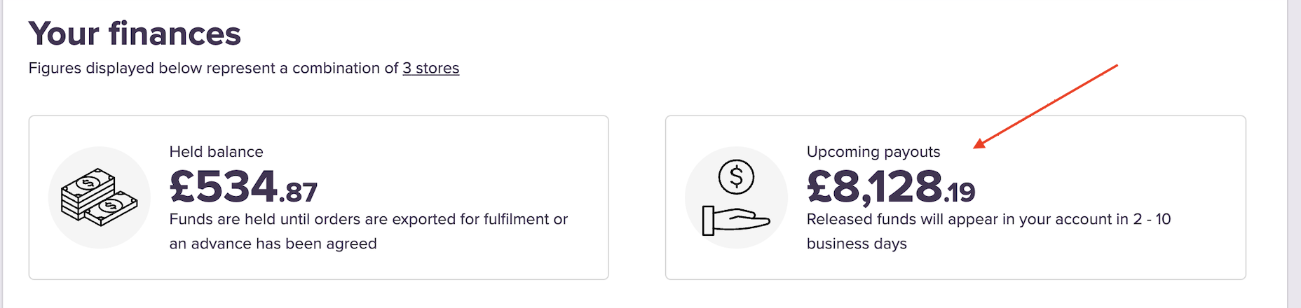 Funds for exported orders are initially shown in our Upcoming payouts section, representing funds we have moved into your Stripe account.