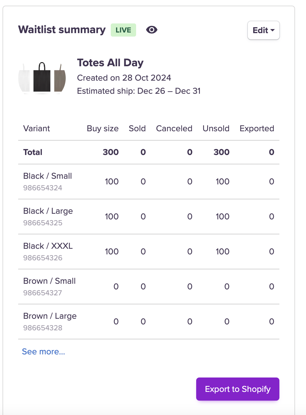 A brand has auto-exports turned on, with a waitlist of Totes with 100 units available for 3 black-colored tote sizes. If 100 (or more) units arrive for the Small, Large, and XXXL in Shopify, then the waitlist will auto-pause.