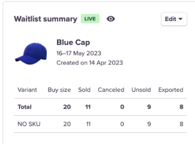 Let’s say a brand has auto-exports turned on, with a waitlist of Blue Caps with 20 units available and 11 open pre-orders. The latest estimated ship date is May 17th.